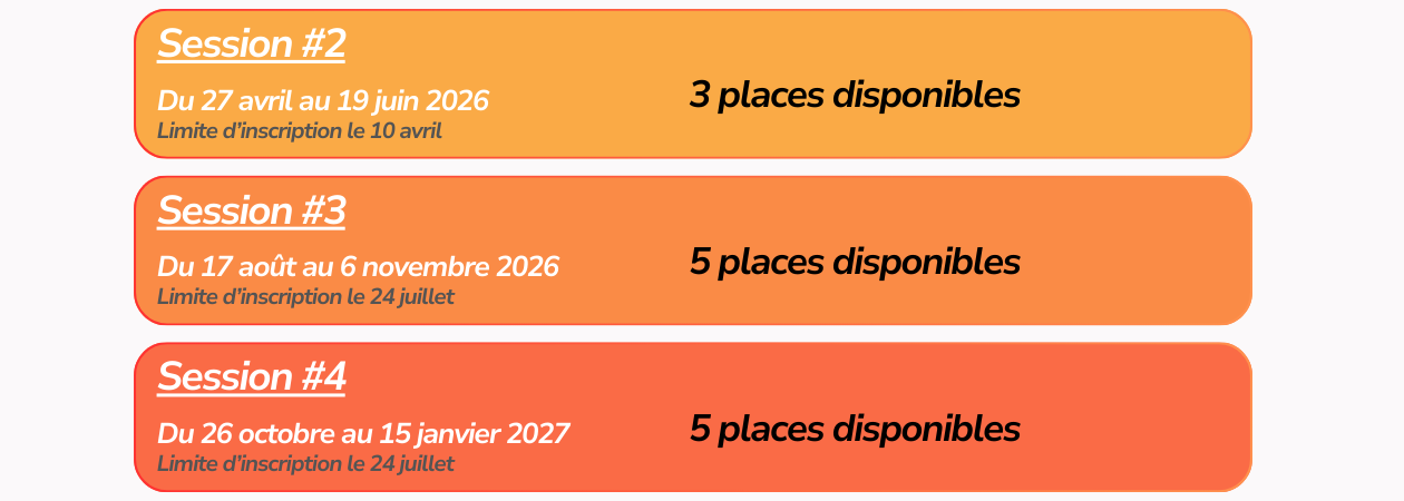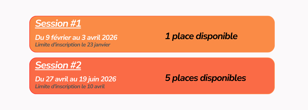 Les 9h d’accompagnement individuel permettent d’approfondir des points spécifiques selon tes besoins.